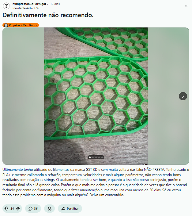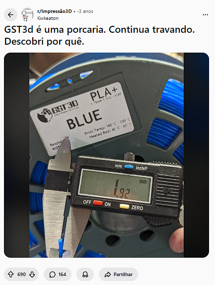 Não significa que filamentos mais caros estejam livres de problemas, a diferença é na raridade que acontecem e, quando acontecem, a fiabilidade que está por trás da marca para nos compensar/oferecer um filamento novo.